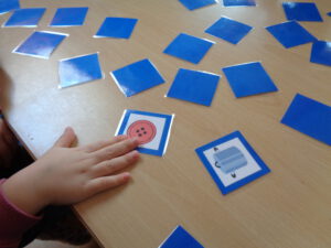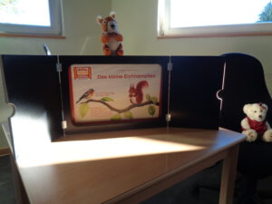 Hinzu kommen Bücher und Geschichten mit dem Kamishibai (kleines Erzähltheater), mit denen der Grundstein für die Freude am späteren Lesen und Schreiben gelegt wird. Dabei werden die Kinder in jede Geschichte mit einbezogen und sollen selbst sprachlich aktiv werden. Wir nutzen z.B. auch ein gebasteltes „Reime-Memory“.