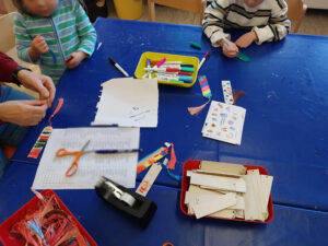 Jedes Kind hat zudem von der Bertelsmann-Stiftung ein Vorlesebuch für zu Hause bekommen. Dafür wurden im Mal-und Bastelraum fleißig Lesezeichen gebastelt, die die Kinder mit den Büchern nach Hause mitnehmen dürfen.