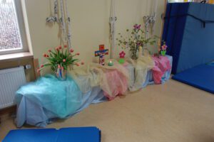 Ein Highlight war unser gemeinsamer Morgenkreis, zu dem wir einen besonderen Gast begrüßen durften: Pastor Kotterba von der Trinitatisgemeinde besuchte uns und erzählte den Kindern auf anschauliche und kindgerechte Weise die Ostergeschichte. Dabei wurde schnell deutlich, dass viele Kinder bereits ein erstaunlich großes Wissen über die Bedeutung von Ostern mitbrachten. Mit viel Interesse und Neugier beteiligten sie sich am Gespräch, stellten Fragen und teilten ihre eigenen Gedanken.