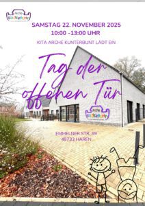 Die Kita Arche Kunterbunt Emmeln lädt herzlich zum Tag der offenen Tür ein. Im Zuge der Anmeldetage für Kitas und auch für andere Interessierte stehen von 10:00 Uhr bis 13:00 Uhr  die Türen offen.