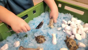 Im Bauraum vergnügen sich Eisbären, Haie, Orca, Polarwölfe, Pinguine oder Robben im Polarwasser, was mit großen Eisbrocken, Eiswürfeln, Steinen, Styroporplatten und ganz viel Rasierschaum zum Spielen, Fühlen und Erkunden einlädt. Im selbstgemachten Schnee aus Stärke und Rasierschaum verstecken sich ebenfalls Tiere, die mit Löffeln oder Kelle ein- oder ausgegraben werden. Mal jagen die hungrigen Eisbären des Nordpols Seerobben oder planschen mit ihnen im Eiswasser. Ein andermal hüpfen die Pinguine des Südpols über die Eisschollen, bevor die Wale sie durch das eisige Wasser verfolgen.
